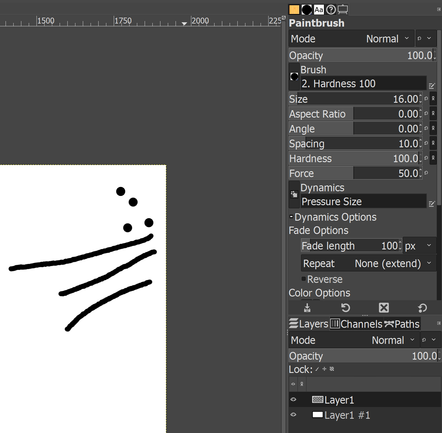 I have searched, viewed or read dozens of suggestions for making a stylus work with Gimp in the forums, YouTube, and other internet findings and have tried many of them. What I have been able to do so far is to create dots at the beginning of each attempted stroke of a brush (or pencil or pen). The dots are the same size no matter how much pressure I use to make the stroke, but at one point the dot sized were proportional to the pressure. The screenshot shows examples of four attempted strokes of the brush, and below those marks are strokes made using the mouse.