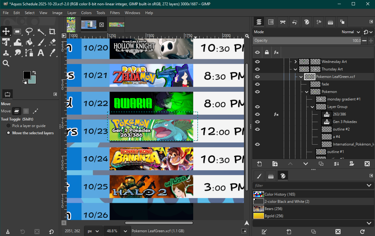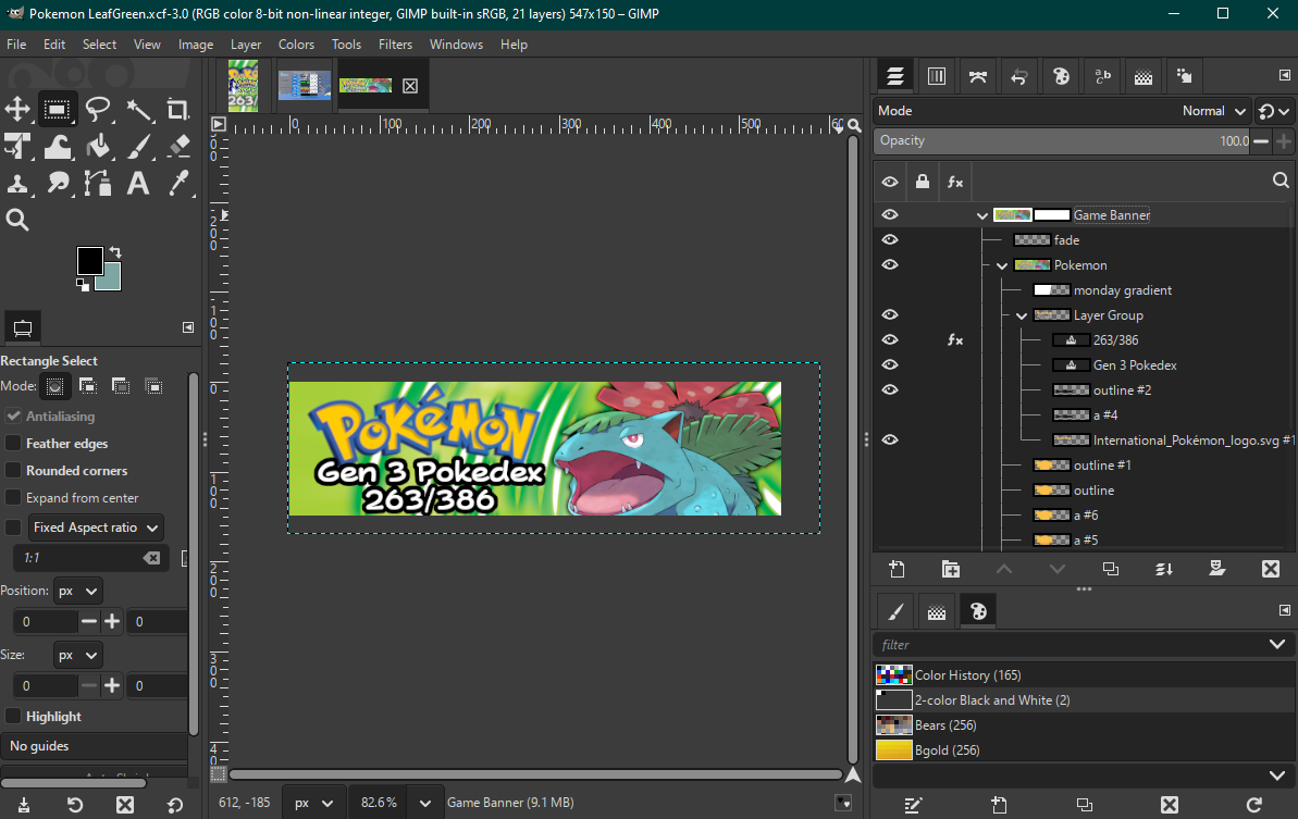 Here's the result when effects are active. Notice that the layer mask on "Pokemon LeafGreen.xcf" is missing