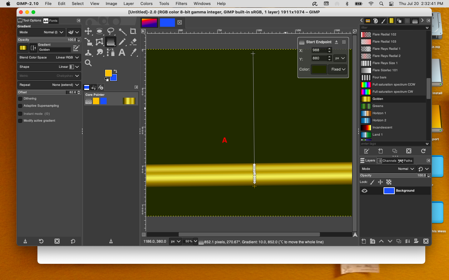 Not too long ago (months) I could make a linear gradient of, say, seven colors spread across the width or height of a project simply by drawing a line from the top to the bottom of the layer. Since a week ago, that has changed: instead of the color stops (square thingies) being spread across most of the line I draw, all the squares are bunched together in one spot.