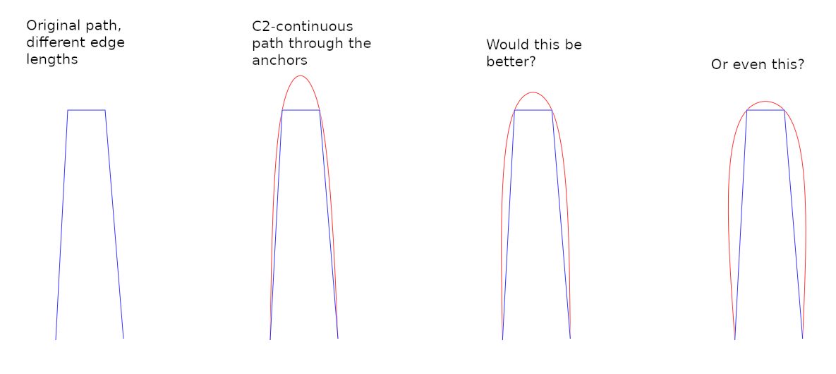 The first tuning parameter: Let us consider a straight-edge path. The tuning parameter adjusts how strongly the different lengths of the edges are taken into account; see the above pictures. Let us call the parameter K. If K=0 the lengths are not taken into account at all, just like in C2-continuity. I put K=1 as the default since I think it gives nice results.