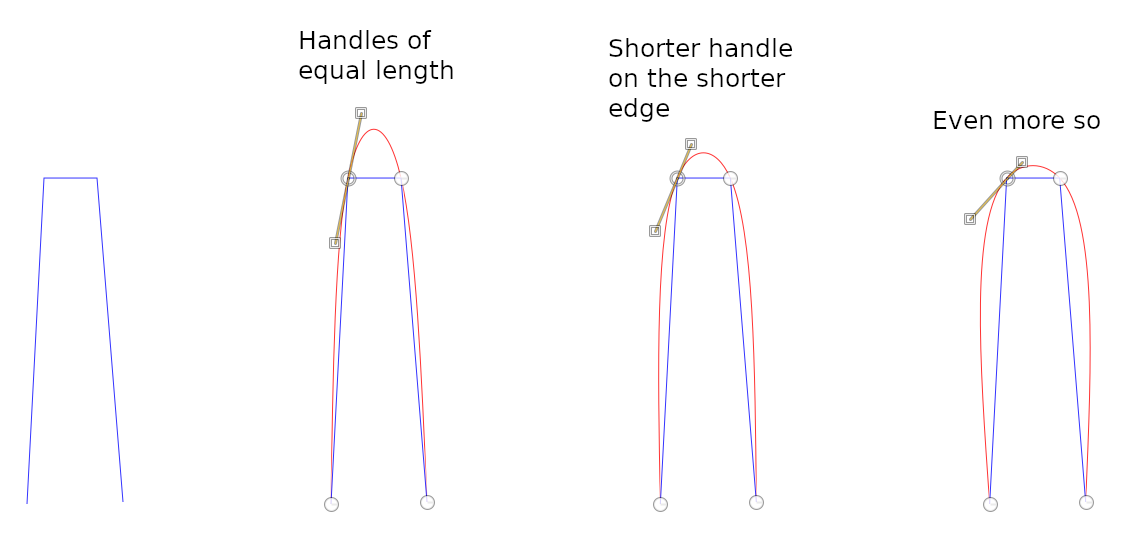 So I think that the edge lengths should be taken into account when making the handles. But then C2-continuity is no longer possible, not even C1-continuity. But G2-continuity is possible. And I think that it is this condition which really counts visually. Continuous curvature means that the curve is very smooth.