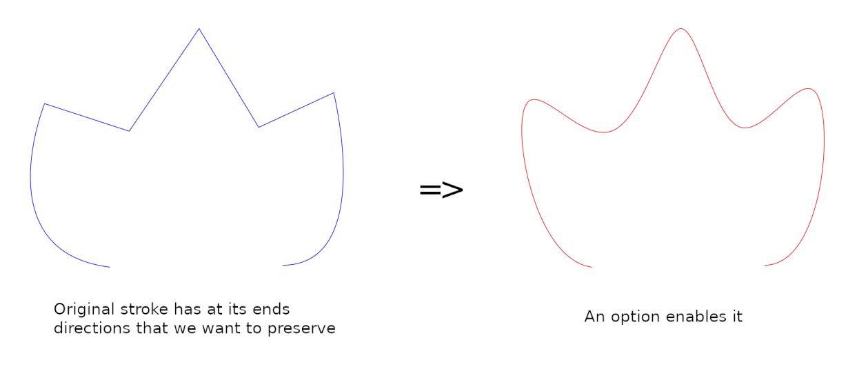 There is also an option on how the end parts of open strokes are treated. This is useful only if the original path has some curvature and you want to preserve the tangent directions at open stroke ends: