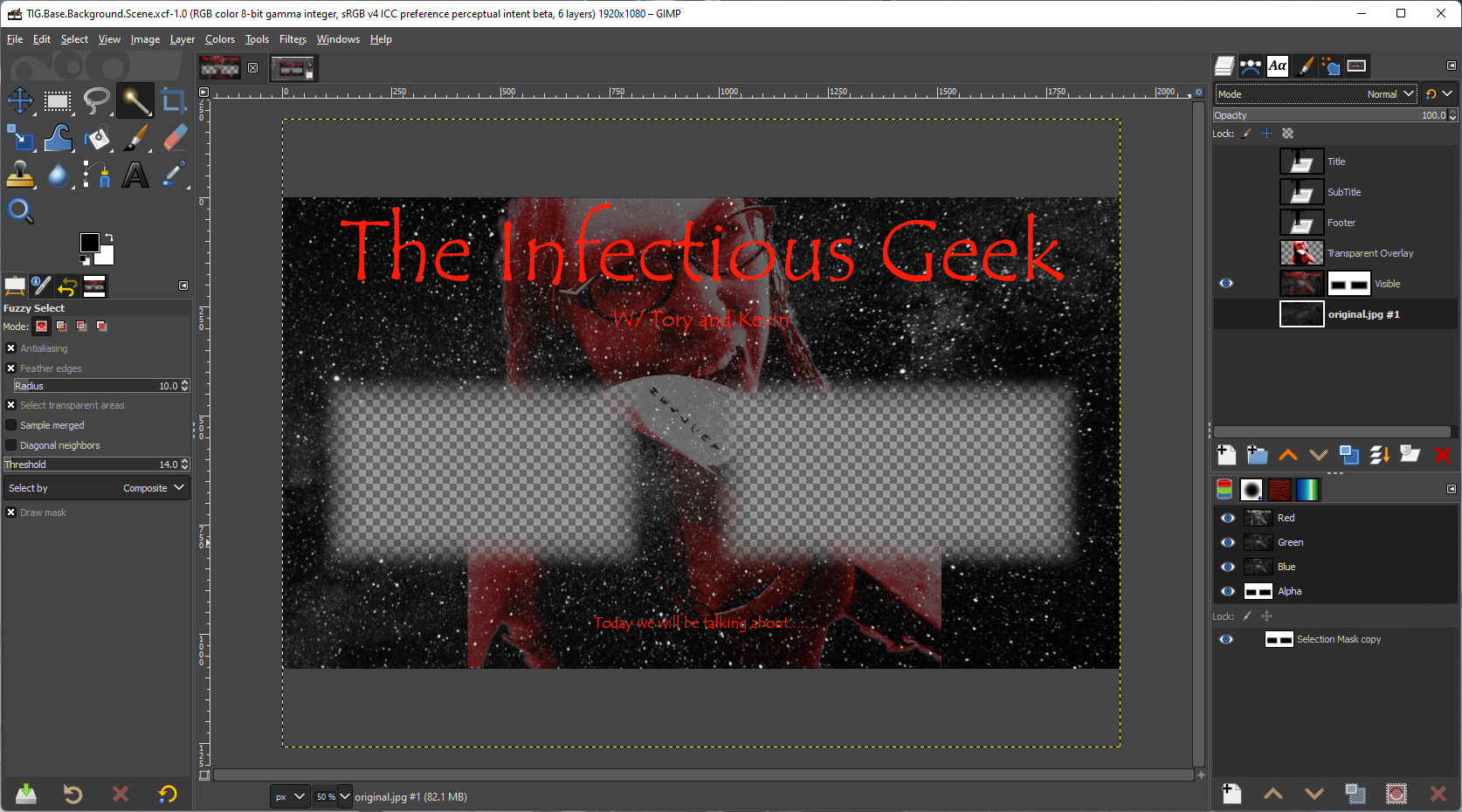 So... I'm very new to GIMP and anything creative. I'm trying to setup a template for my wife. She wants to podcast with a custom background, once or twice a week. After all the tutorial videos and messing around with the app for a few days, I've decided to do this with the setup in the picture. layers: title, subtitle, footer, overlay, image of whatever for the wallpaper... Then, I created a channel for her host/co-host selection areas. That way, I can just create a new layer from visible based off all her data that changes every few days, and apply a layer mask from the channel I created.
