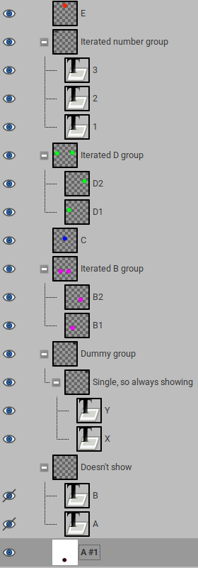 I have a gimp file with these layers : a, b1, b2, c, d1, d2 and e.