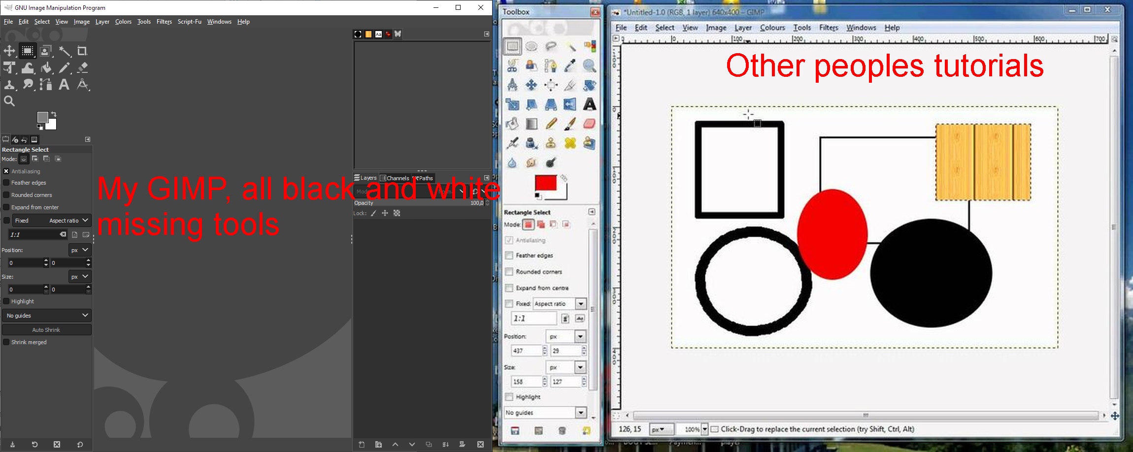 More things, where can I choose colors and shapes to draw with? How can I draw circles, rectangles, triangles and the like? Is there a skin or something to "dumb down" the interface to appeal to MS Paint users, but with more tools available IF you need them? For example, in MS Paint I can't make a rectangular selection and scale it on the fly (WYSIWYG), whereas in GIMP, this is possible and I did succeed with it, once.