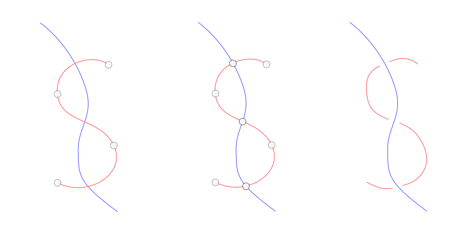 In the middle picture the plugin has been applied: The red path is chopped by the blue path. You see there 3 new anchors at the crossing points; those 3 anchors are in fact double anchors and stroke ends. The red stroke has been cut into 4 shorter strokes, so the path consists now of 4 strokes. To show that they are indeed 4 separate strokes, I moved their ends a little apart, on the right.