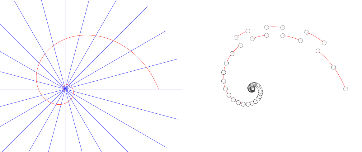 A spiral chopped to pieces. To begin with, the spiral (red) is one stroke. It is chopped by the fan of lines (another path, blue).