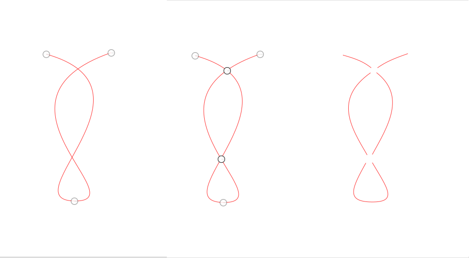 You can also use the plugin to chop a path by itself. On the left we have a red path, one stroke with 3 anchors. In the middle picture the path is chopped by itself. This means that the stroke has been cut at the crossing points. On the right I moved the stroke ends a little so that you can see how the cuts are done. Now there are 5 strokes.