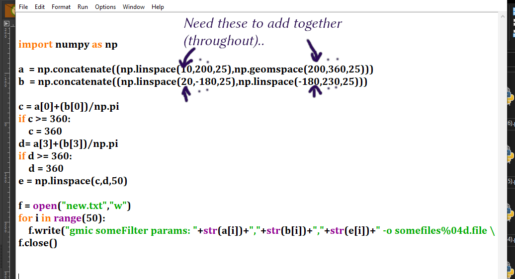 f.write("gmic someFilter params: "+str(a[i])+","+str(b[i])+","+str(e[i])+" -o somefiles%04d.file \n" % i)