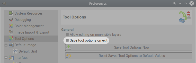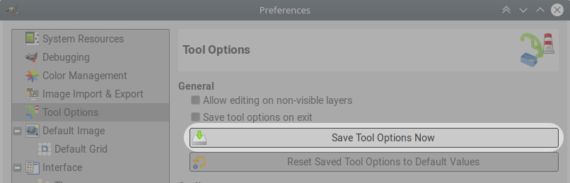 - Click the Save Tool Options Now button: