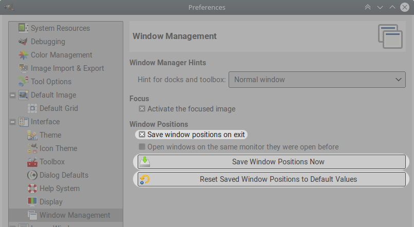 Your options are similar for window positions, but this is usually less critical. Saving window positions is often a good idea, but be careful if you use several monitors, a saved window position can end up on a screen that is no longer here. Settings are in Edit ➤ Preferences ➤ Interface ➤ Window management ➤ Window positions: