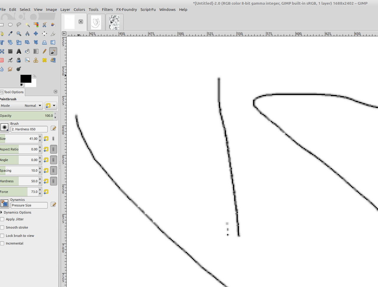 When I zoom in to 2x zoom and draw with the mouse with the tool options as pictured, the quality of the stroke looks noisy and bad. In the long diagonal stroke, the centreline is noticeably darker in some parts and it makes the width look uneven. It's a little less noticeable at 1x zoom. There are sometimes 'bites' taken out of the line, when there's a light-coloured pixel where I'd expect one of the same grey colour as as its diagonal neighbours along the line. These bites are noticeable even at 1x zoom. As well as these issues, when I draw a nearly vertical line by dragging the mouse down and slightly to the right, it seems as though the brush dabs are jittering from side to side down the length of the stroke. Why do these things happen? In drawing programs such as Krita or Paint Tool SAI, I've not reproduced such issues.