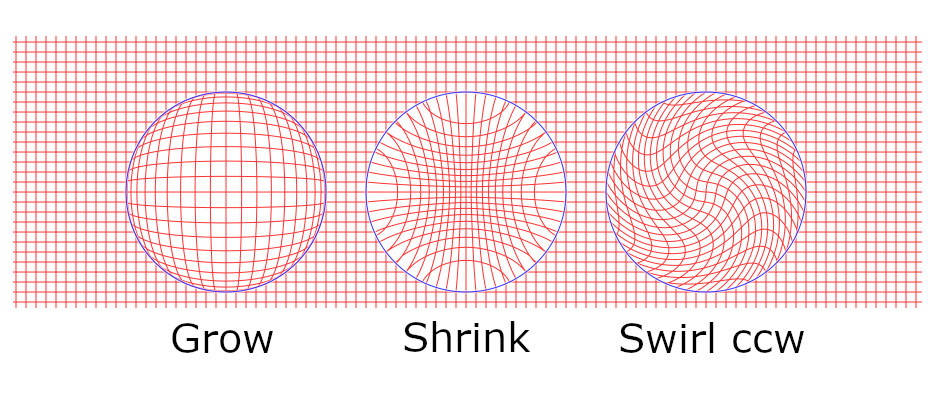 It appeared that while the warpings on the grid are quite pretty (to my eye at least), trying something more practical needs some care to get acceptable results. Here I tried a text. Left to right: Grow, Shrink, Swirl(cw), all with some smoothing (and now without the blue circles):