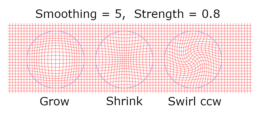 The plugin has two parameters: Smoothing and Strength. Smoothing controls what happens at the edge of the circle. If Smoothing = 0, there will be sharp bends like in the picture above. When Smoothing > 0, the bends are rounded. The rounding happens inside the circle. The other parameter, Strength, controls the amount of the warping effect.