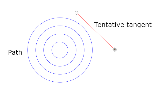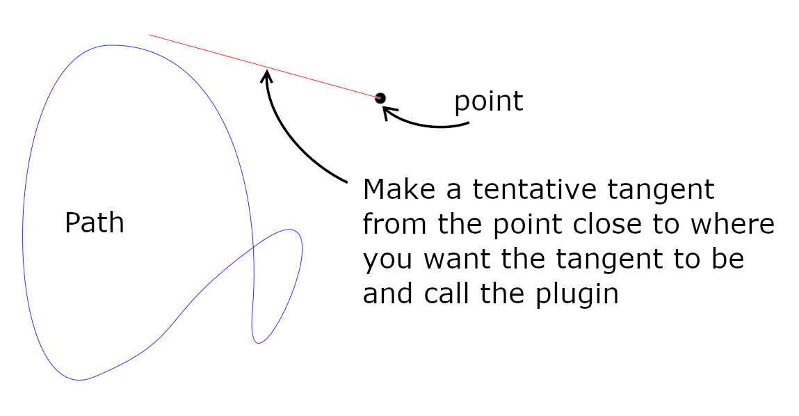 Tangents or normals from a point: Suppose you have a path and you need to draw a tangent to it from some point. In the picture below the Path is in blue. I marked the point with a black dot but that is only for this explanation. It is just some point in the plane. The red line is the tangent you want to draw.