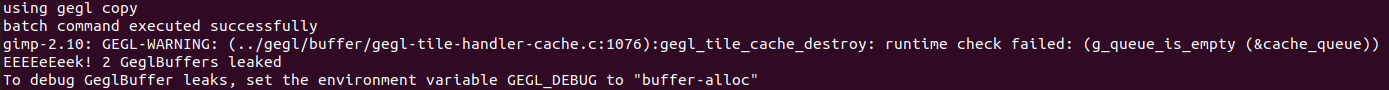 gimp-2.10: GEGL-WARNING: (../gegl/buffer/gegl-tile-handler-cache.c:1076):gegl_tile_cache_destroy: runtime check failed: (g_queue_is_empty (&cache_queue)) EEEEeEeek! 2 GeglBuffers leaked To debug GeglBuffer leaks, set the environment variable GEGL_DEBUG to "buffer-alloc"