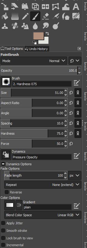 I'm new to the forum and just have a quick question, for which I'm hoping the answer is staring me in the face. I'm using 2.10.8, have successfully installed a tablet, use no plug-ins, etc. and am playing around with sketching and drawing. I'd like to get to coloring if at all possible, except that every time I try to pick a solid color that isn't grey-scale black and white, if I'm using just a regular Gimp-installed brush, it defaults to using a gradient?