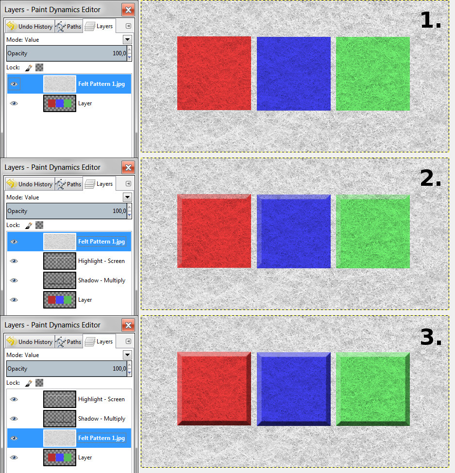 I did it by applying the felt texture, which has a lot of white with a bit of medium gray, with the 'Value' Blendmode to the colour shapes (1.), and it seems, there arent any other options, except 'Multiply'.