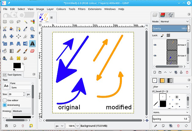 What I do not like are the default settings for 'Length of Wings' and 'Brush Thickness Type', so I have adjusted them in the attached script arrow-set-size.scm