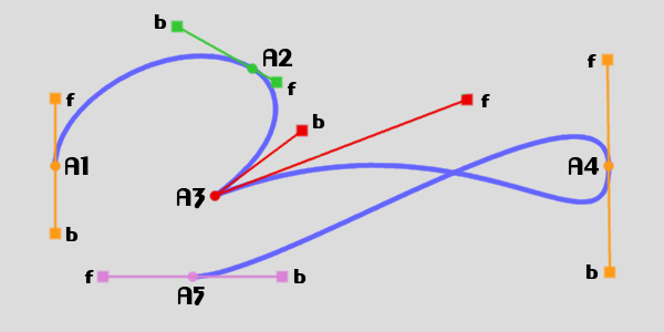 Each anchor becomes associated with two handles, one for the curve that ends on it (the "backward" handle) and one for the curve that starts from it (the "forward" handle). If these handles are aligned (A2) the curve remains smooth, but cusps can be obtained with handles on the same side (A3), and loops are obtained by interchanging the handles (or rotating them both by half a turn around the anchor)(A4).