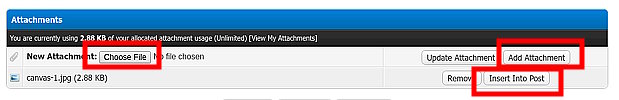 - Use the New Attachment Option at the bottom of the editor window for jpegs, pngs. If the image is reasonably small, insert it into the post.