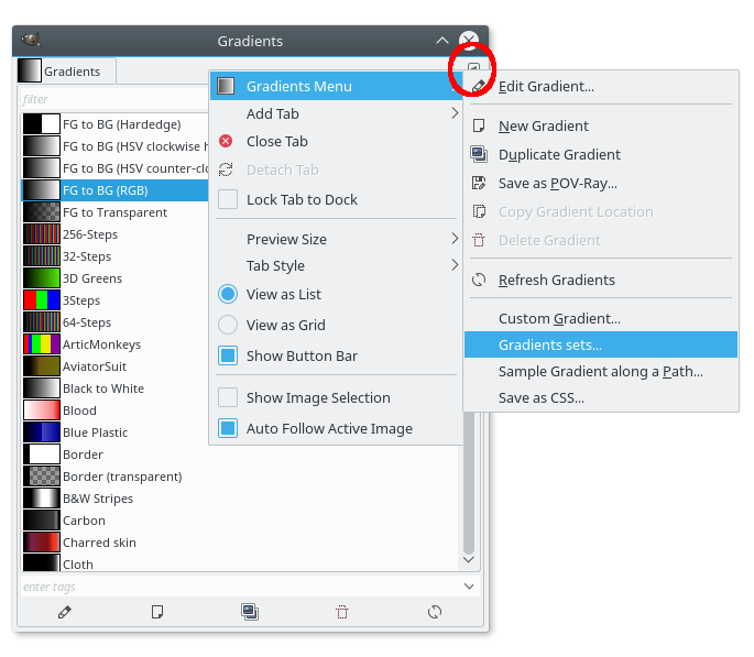 But remember: to start properly you should NOT have any resource directly inserted into the standard Gimp resource folder, you should have all your xxx_storage folders with a clean .active file and you should use the ofnuts' manager for activating them (start one at a time and check), if you use my .ini file you will see the various resource managers under Help.