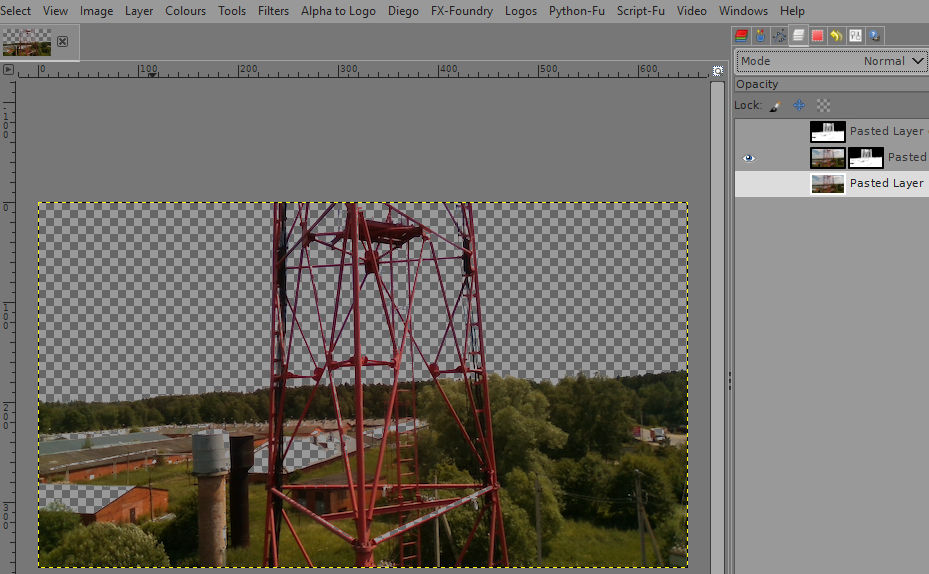 Quote:Use G'MIC Inpaint to remove the tower .....The reason I suggest this is that masking does not need to be that precise for Inpaint to synthesize the background. ...providing the OSX/MacOS user can find a Gimp / Gmic combination that works.