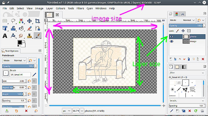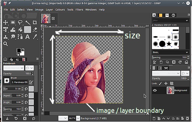The yellow dotted line is the 'edge of layer' marker, one layer so also the edge of the image. That is the size that you get when you Save or Export the image. The Image size in pixels is also shown top of the Gimp Window.