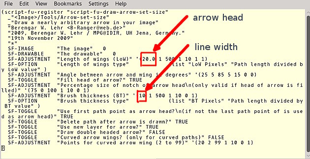 What I do not like are the default settings for 'Length of Wings' and 'Brush Thickness Type', so I have adjusted them in the attached script arrow-set-size.scm