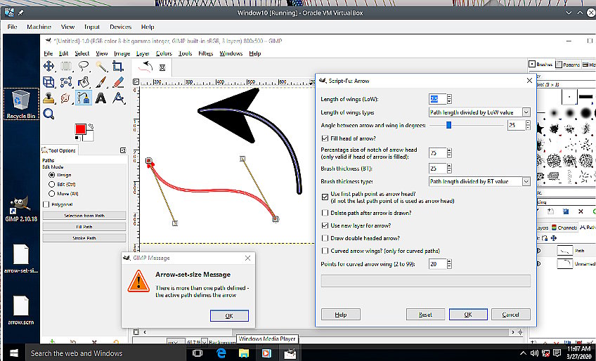 Decided on this one from http://www.programmer97.talktalk.net/Files/arrow.zip http://programmer97.byethost10.com/Files/arrow.zip which is kept very up-to-date, with a sensible set of options. Do download it, it comes with a useful PDF on use. Un-zip, put the script arrow.scm in your Gimp profile ./gimp-2.8/scripts folder or for Gimp 2.10 C:\Users\"yourname"\AppData\Roaming\GIMP\2.10\scripts