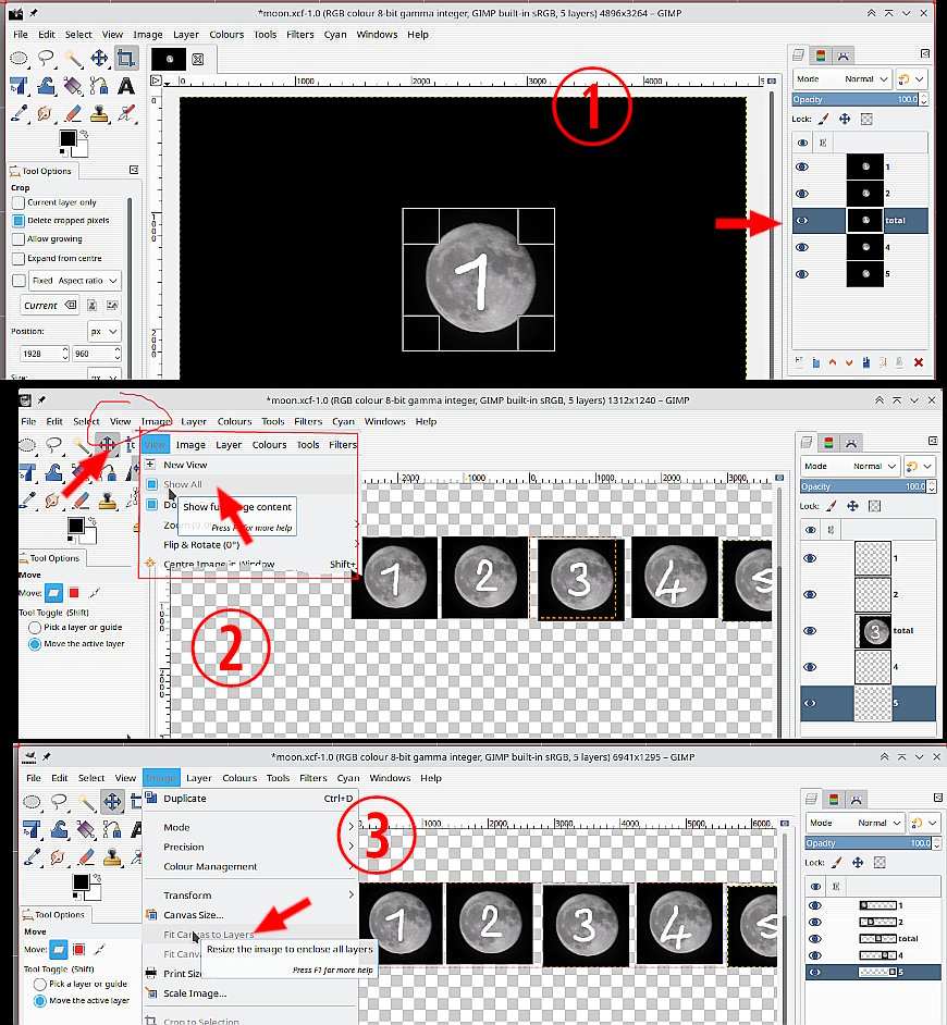 I am new to using GIMP, and could use your advice/input. I have several solar eclipse photos from the April 2024 eclipse, and I would like to arrange them in a sequence. I'd like my total eclipse photo to be in the center of the sequence, with the stages leading up to it, and after it on either side.