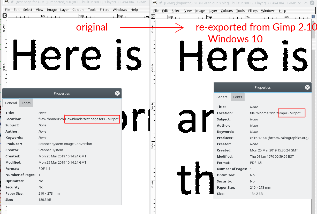 Now looking at your exported from Gimp PDF all looks equal, apart from the blurriness, there is that slightly smaller file size, might/might not be relevant.