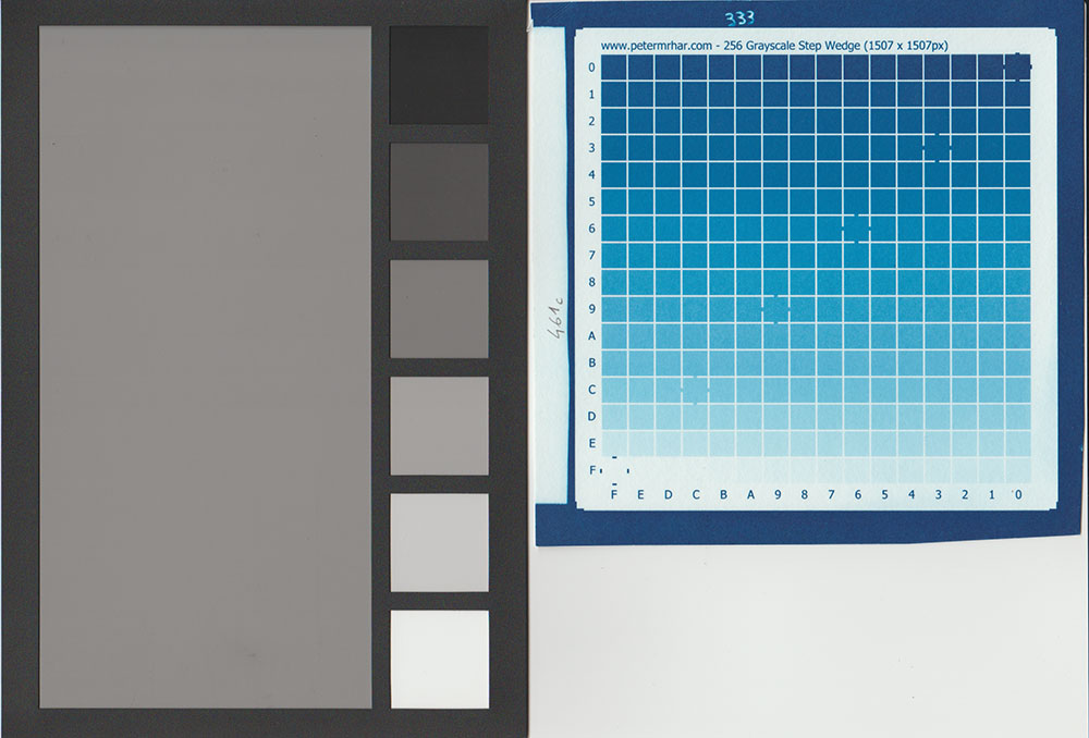 My test prints are alternative photography 256 step wedges, i.e. little squares of degrading tones from the darkest to paper white that I print by hand using an old photographic process.