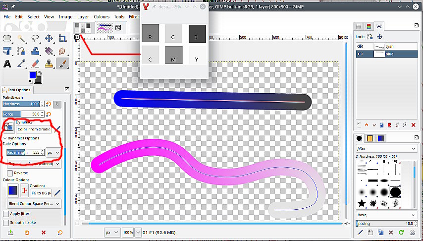 (09-25-2021, 08:23 AM)denzjos Wrote: I wonder if one can use gimp to change a colour intensity along stroking a path depending on the length of the path : from zero saturation on the start of the path to full saturation at the end of the path. The GEGL saturation tool Color -> Saturation is a bit peculiar, the scale is 0 to 10, however zero is desaturated so, You could try stroking the path, with the paint tool, using the dynamic color from gradient and a suitable fade length. The gradient from the-colour-used to the-colour-used desaturated. This example, the primaries desaturated in separate image to colour pick. Someone will probably come up with a script for this, I thought I remembered one but not able to find it.