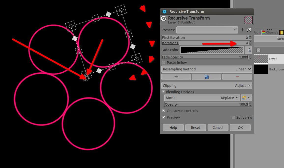 Once it's done go to Filters ➤ Map ➤ Recursive transform, a window opens put  Iterations 4 (it will add 4 more circles on top of the one you already have),