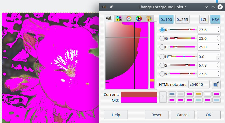 (11-11-2018, 04:38 PM)rich2005 Wrote: You have color management in force Hey, Rich2005 At first it didn't work in my previous reply (now edited). When I started gimp and did some work I realized the pink had vanished from the square color pool on the left however pink was still showing up in the R,G etc rectangular select trays I don't know why but the Marked colors weren't ticked when I went to options as it seemed it corrected itself somehow. However, after messing around I had on LCh instead of HSV. Thanks for the help!