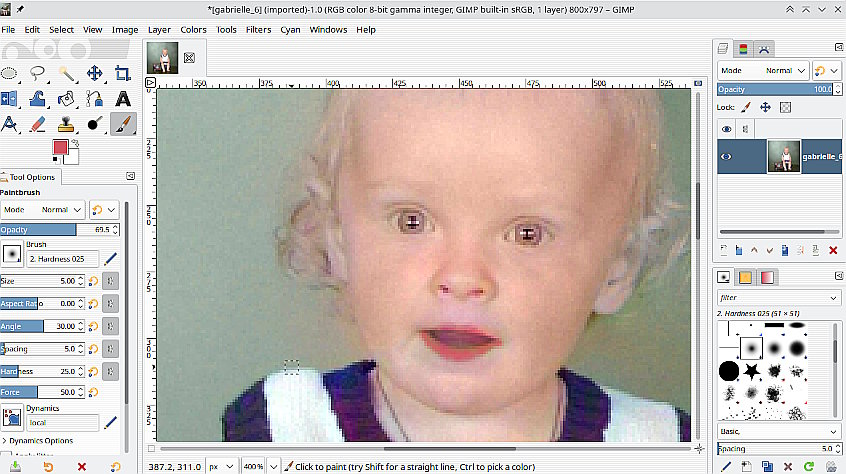First I used Colors/Levels and with the black, white and gray pipettes. Then I corrected the lips with a light pink-orange color of the brush, mode LCh Color with different opacity / hardness and strength.