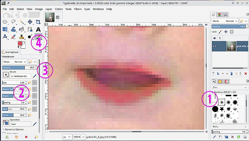 Then using a stock fuzzy brush  (1) Reduce the brush size to suit the image (2) Reduce the opacity (3) Select a reddish colour from the top lip (4) and over-paint the bottom lip.