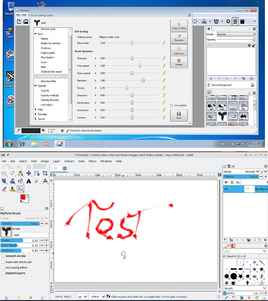 (08-20-2025, 07:03 PM)Quasar999 Wrote: i can't modify or create a MyPaint brush preset. .....snip........ Correct, you can't , at least not using Gimp, MyPaint brushes are quite complex and are best edited using the mypaint program. Next snag is Gimp is still using MyPaint type 1 brushes, so you need a MyPaint 1.x installation. This a Mypaint 1.1 in a Windows VM to modify an existing brush. It saves to C:\Users\your_name\AppData\Local\mypaint\brushes Then in my kubuntu Gimp 3.0.4 appimage - make a folder / path for your bespoke brush in Edit -> Preferences -> MyPaint Brushes hmm, I need more practise.