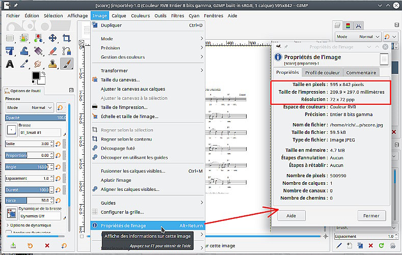 • Pour ce faire ,Je fais FICHIER>OUVRIR en tant qu'image( 1 page de musique dans le cas présent); il s'agit d'une page jpeg en A4 comme la NOUVELLE IMAGE.