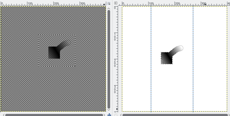 2) the distance between the left edge of the shape and the left guide is exactly the size of the transparent margin in the source copy. This because I moved the floating selection and let it snap to the guide (and what snaps is the layer boundary, even if you don't see it).