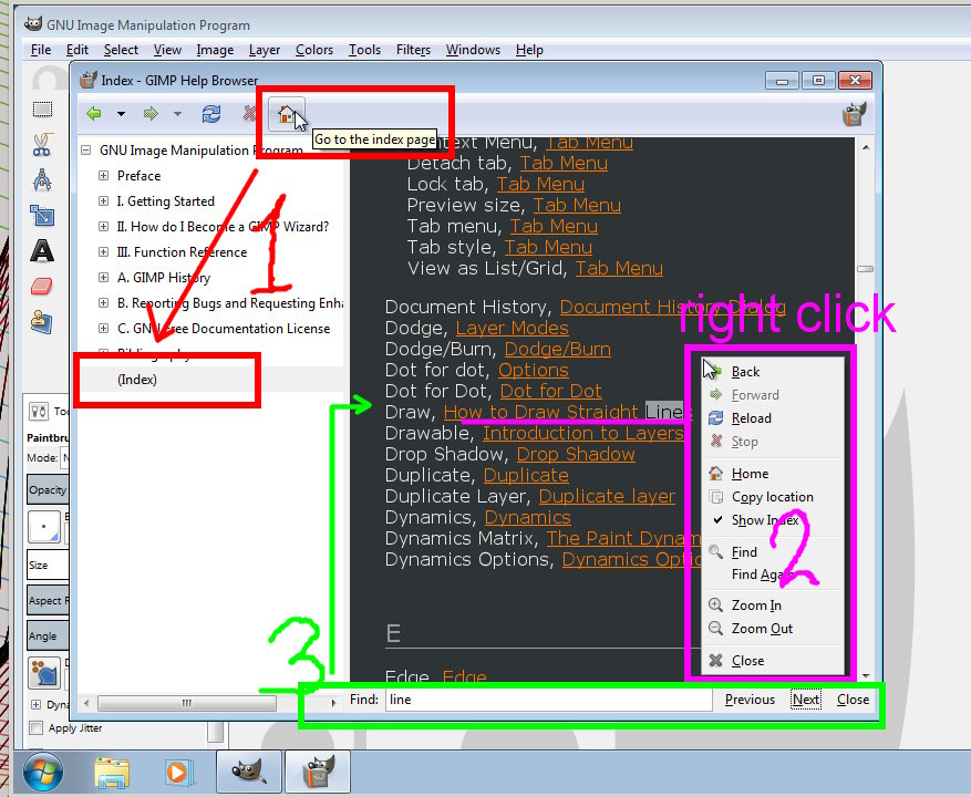 I personally do not have help installed in my system (linux) I prefer a PDF and there is a good one here: http://gimp.linux.it/www/meta/ gimp-en.pdf which is searchable and has a good index. Needs it for the 900 something pages.