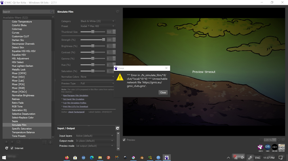 I am trying to apply some filters from Gmic, but I get error like these. These errors mostly occur on color filters. Most other filters work fine. Any suggestions for solving this?
