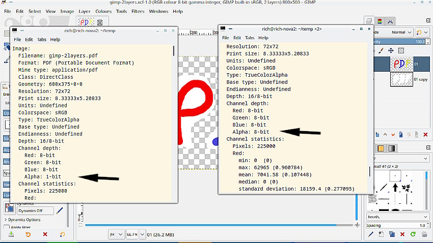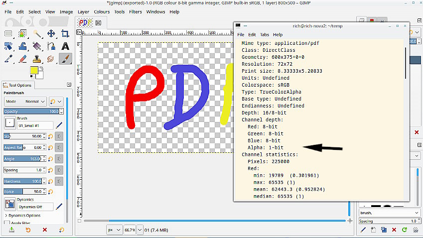 Gimp doesn't seem to retain neither alpha or channel information on PDF exports.