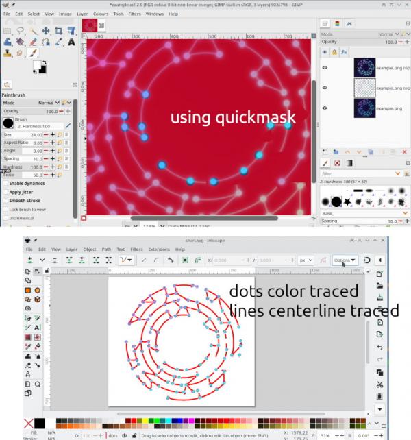 My assumption is to use GIMP to kill the background and Inkscape to trace the dots to vectors. Is there a way to do this purely in one software?