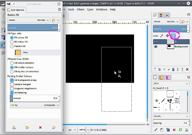 However, if I add a new layer (using all default values), make sure the new layer is the active layer, then use the 'Rectangle Select Tool', and 'Bucket Fill Tool', the selected area does not fill with the color. I'm using GIMP 2.10 on Windows 10.