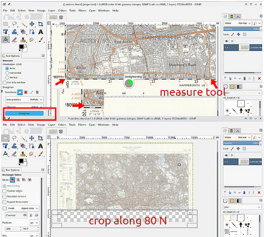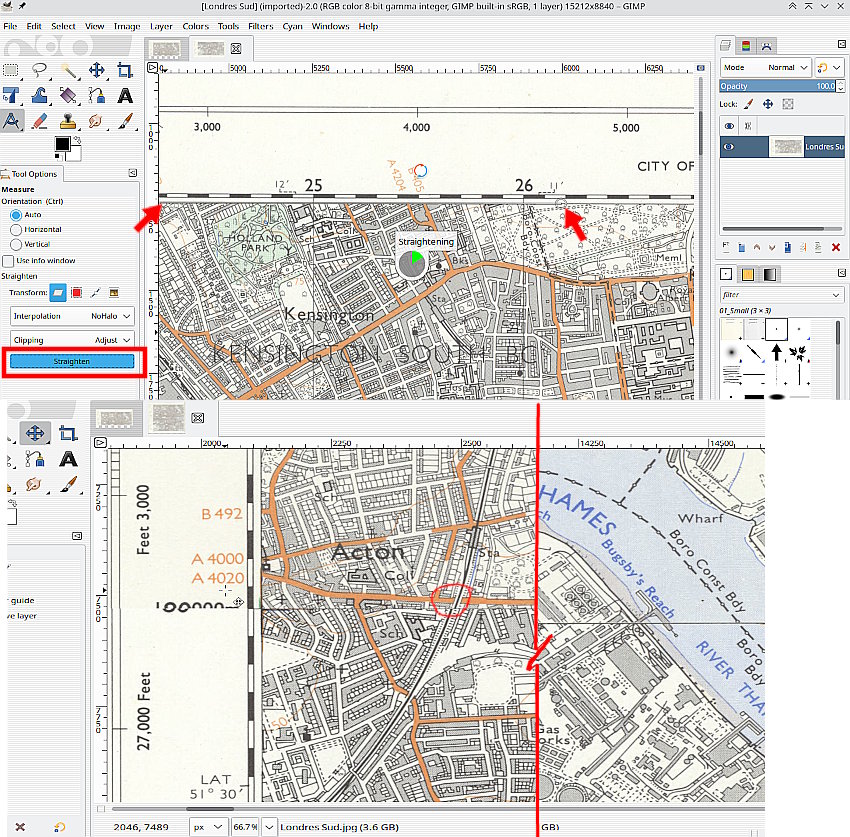2) For the North, use the measure tool along the 80 deg north line. Be very precise with the start and end of the measure line, it is used to straighten the image. Click on the straighten button and wait for it to finish.