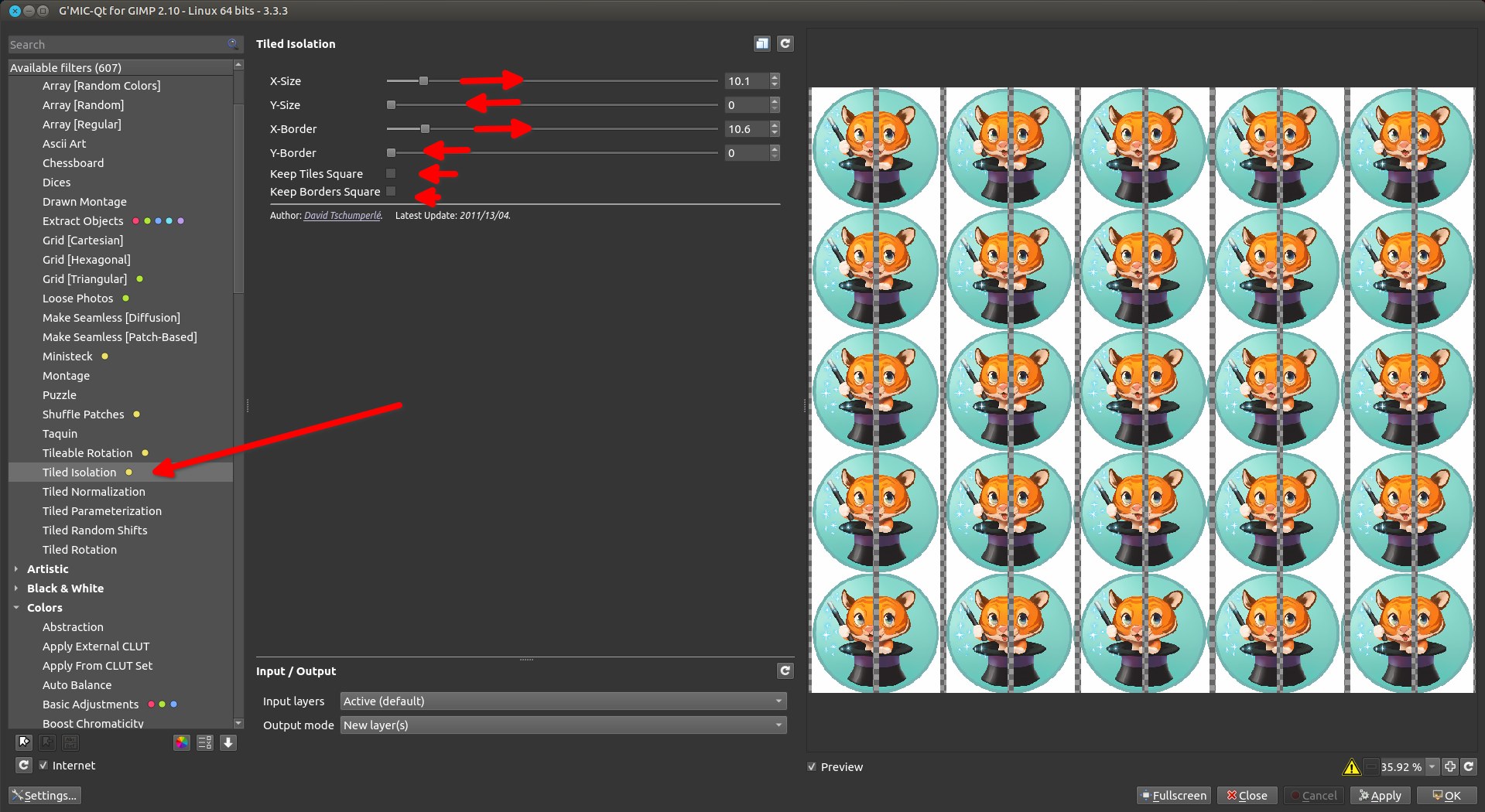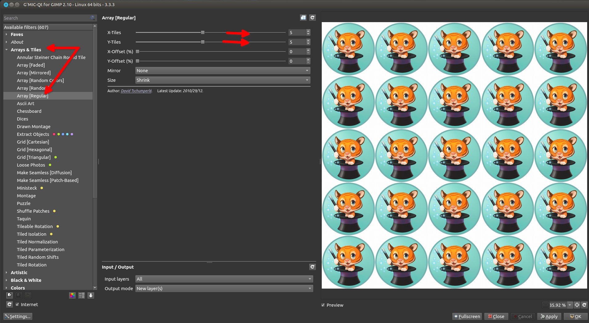 (02-17-2024, 04:12 AM)PixLab Wrote: About Small Tiles, G'MIC does even a greater job than the original GIMP's filter, as there are no aliasing with G'MIC Wink (Arrays & Tiles > Array [Regular])