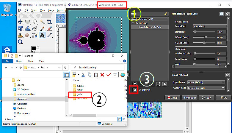 (2) Once updated make sure any out-of-date files are removed. Delete the folder C:\Users\"yourname"\AppData\Roaming\gmic A new default one is made when you next run gmic.