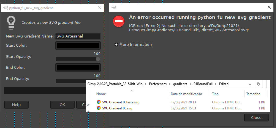 I searched for . ggr that was supposed to be created, either by refreshing the gradients window several times, or by checking the Gimp's gradient folders, and was not found.